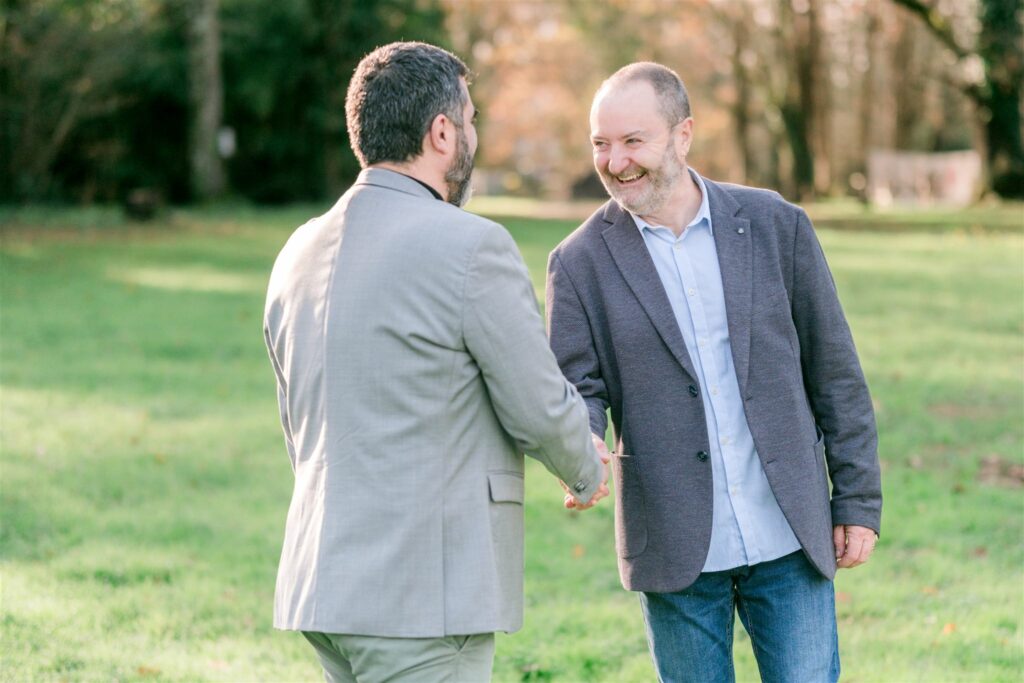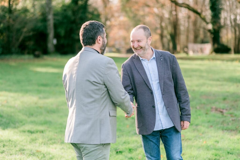 Nous avons opté pour une composition innovante en deux tiers : le candidat de dos, les bras ouverts dans un geste d’accueil, tandis que le co-listier s’avance vers lui avec un sourire franc. Cette structure visuelle envoie un message fort aux électeurs de Léognan : le candidat est à l’écoute, il rassemble et il valorise son équipe. L’utilisation de la lumière naturelle assure une cohérence visuelle parfaite entre les différents supports de communication.